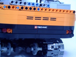 Like the 8043, this model uses the “2 drivetrains through 1 turntable” principle. The chassis has all the gear-reduction (1:15 total gearing) reducing the side-effects during upperstructure rotation.